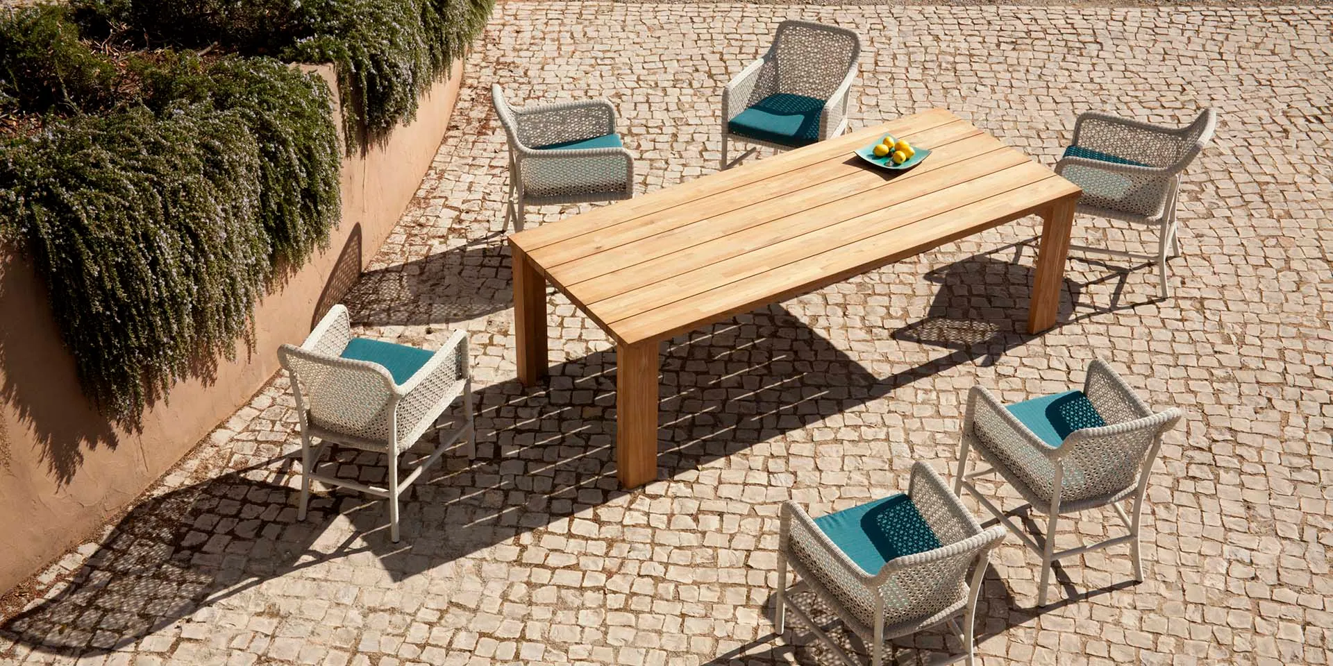 Aus rustikalem Teakholz Die Titan Kollektion erweitert sich um 3 zusätzlichen Artikel (Armstuhl, Bank und Tisch), die ein perfektes Beispiel der Verbindung von rustikalem Teak-Holz und pulverbeschichtetem Aluminiumgestell sind. Rustikale Kollektion charakteriesiert sich durch die variable Maserung, was ein vorsätzliches Element des Entwurfes ist. Die Titan-Reihe ist ein Teil von unserer rustikalen Kollektion, die Teak-Holz in einer variablem Maserung zeigt. Diese Eigenschaft ist ein Element des Entwurfes und gilt als kein Produktdefekt. Die schwarzen Stützrahmen der Möbel wurden aus pulverbeschichtetem Aluminium gefertigt.