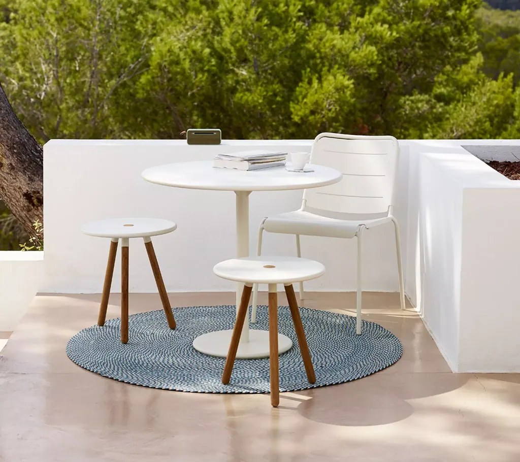 Der runde Tisch Area aus lavagrauem oder weißem Aluminium zeichnet sich durch seine Schlichtheit aus. Der Tisch ist äußerst solide, da weiche Bögen an der Kante und an der Öffnung in der Mitte die dünne Tischplatte zusammenziehen. Das Loch bietet zudem Platz für einen Sonnenschirm, leitet Regenwasser ab und erleichtert die Handhabung des Tisches, während sie gleichzeitig ein Designmerkmal darstellt. Der Area-Tisch misst 110 cm im Durchmesser und bildet in Farben und Material ein gutes Paar mit dem Stuhl Less, kann wegen seines schlichten Ausdrucks aber auch durchaus das Zentrum für andere markante Stühle bilden. Die schrägen Beine stellen ein weiteres Finish des Designerteams Gudmunder Ludvik & Hee Welling dar, die während aller Produktions-phasen auch an Nachhaltigkeit gedacht haben.