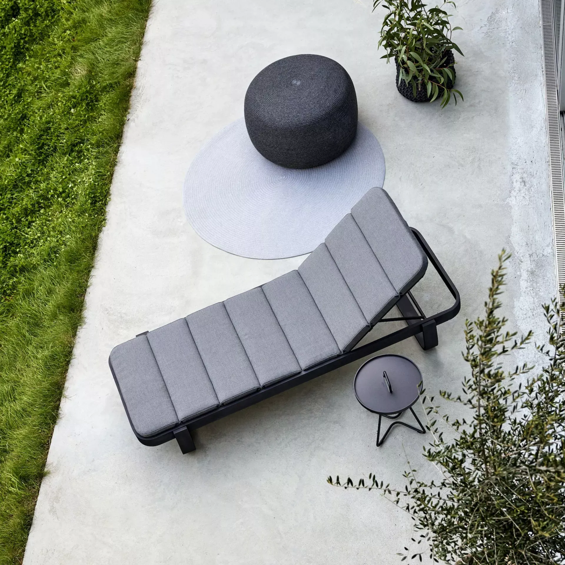 Cut ist eine sehr zurückgenommene Kollektion von Cane-line, die eine Sonnenliege, zwei Hocker und einem Outdoor Bartisch beinhaltet. Die Gestelle sind aus Aluminium gefertigt, witterungsbeständig und zeitlos.