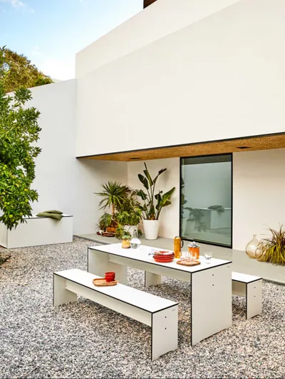 Purismus am Wasser. Die Riva-Kollektion von Conmoto bringt klare Linien an den Pool, auf die Terrasse und in den Garten – mit Bänken, Tischen und Liegen, die sich auf das Wesentliche konzentrieren. Wetterfestes HPL und pulverbeschichteter Stahl trotzen jedem Wetter, während das reduzierte Design zeitlose Eleganz ausstrahlt. Deutsche Ingenieurskunst für alle, die Minimalismus leben.