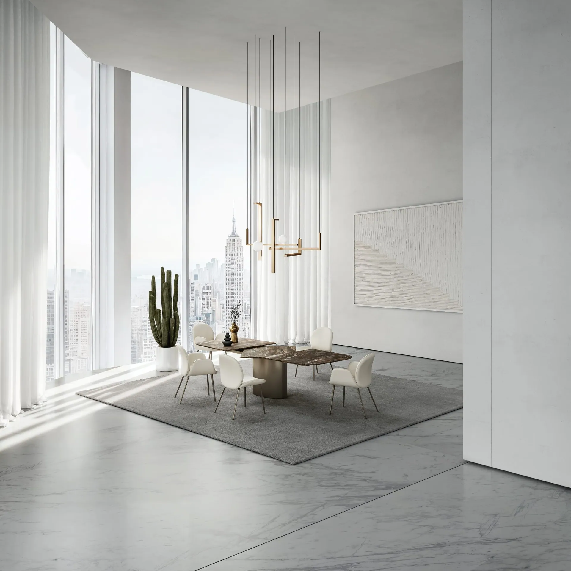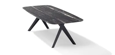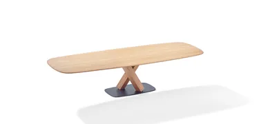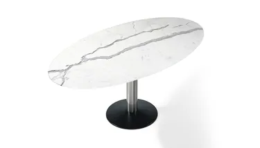 Ein ausziehbarer Esstisch, bootförmig, rechteckig, organisch oder oval, aus Naturstein oder Holz mit Hebemechanismus für eine integrierte Mittelplatte aus Naturstein oder Holz. Der integrierte Hebemechanismus ermöglicht das Anheben der inneren Mittelplatte, nachdem die beiden Tischplattenhälften auseinandergezogen wurden. Eine ausgeklügelte Technik macht die Verlängerung zu einem Eingriff von wundersamer Leichtigkeit. Dieses Modell wird mit 4 verschiedenen Sockeln angeboten.