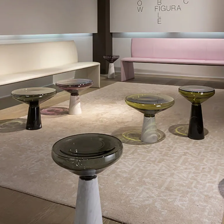 Der Beistelltisch BLOW vereint zwei Materialien perfekt: Stein und Glas. Der Sockel aus Naturstein erdet den Tisch und ist das ideale Gegenstück zur Tischplatte aus mundgeblasenem Glas, die in einem aufwändigen Verfahren hergestellt wird. Die Verbindung dieser beiden – auf den ersten Blick konträren – Materialien erscheint mühelos und fast selbstverständlich. Durch diesen spannenden Kontrast zwischen Tischplatte und Tischgestell entsteht ein besonderes Stilelement. Der Glaskörper, ob transparent oder hellgrau oder violett durchscheinend, bietet spannende Ausblicke.