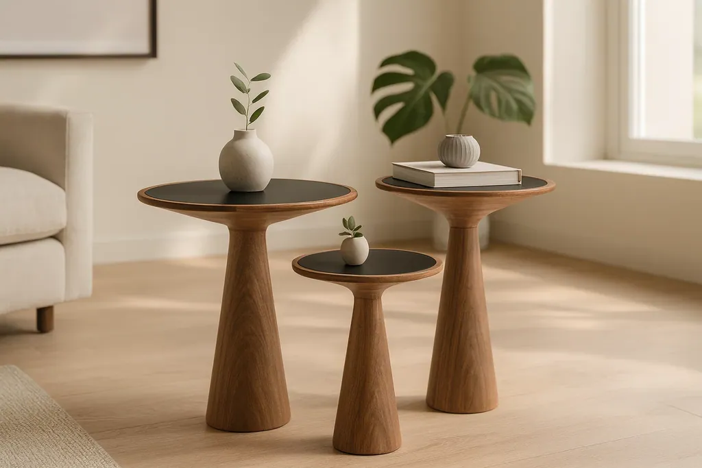 Ein runder Couch- oder Beistelltisch in vier verschiedenen Größen und Formen aus geöltem amerikanischem Nussbaum. Der Tisch ist aus gedrechseltem Massivholz gefertigt. Die eingelegte Glasplatte ist auf der Unterseite schwarz lackiert. Die harmonischen Proportionen, das Spiel mit Rundungen sowie die außergewöhnliche Haptik machen diesen Tisch so einzigartig. Die praktische Aufmachung erleichtert einen Umzug.
