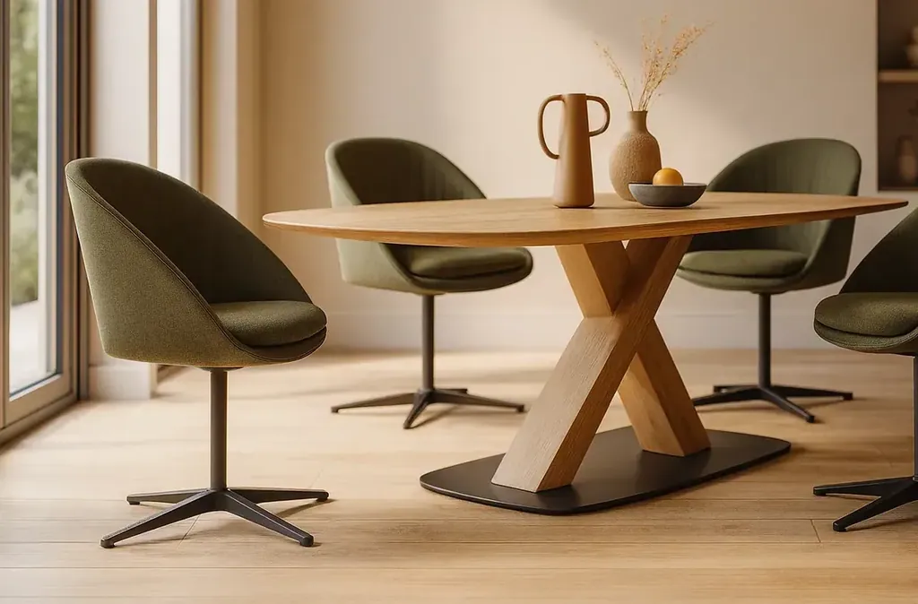 Kann ein Tisch sowohl Ruhe als auch Dynamik ausstrahlen? Das ist möglich – wenn Kreativität, Ausdruckskraft und ein Gespür für Proportionen und Details perfekt zusammenpassen. Dabei kommen modernstes Können und langjährige Erfahrung des Designers Wolfgang C.R.Mezger zum Tragen. Unser Tisch STAN beweist ein ausgeprägtes Formgefühl und überrascht durch seine Leichtigkeit. Seine Eichenplatte ist in Längen zwischen 200 und 280 cm erhältlich. Es scheint fast zu schweben auf den beiden dynamisch gekreuzten Beinen, die stabil auf einer schwarzen Grundplatte ruhen. Ein skulpturales Design – zeitlos und schön.