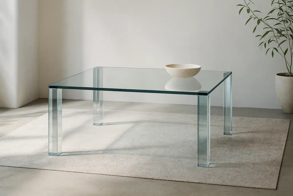 Ein quadratischer oder rechteckiger Couchtisch mit einer Platte aus klarem Glas und Beinen aus Stahl in poliertem Chrom, mattem Chrom oder mattem Nickel.