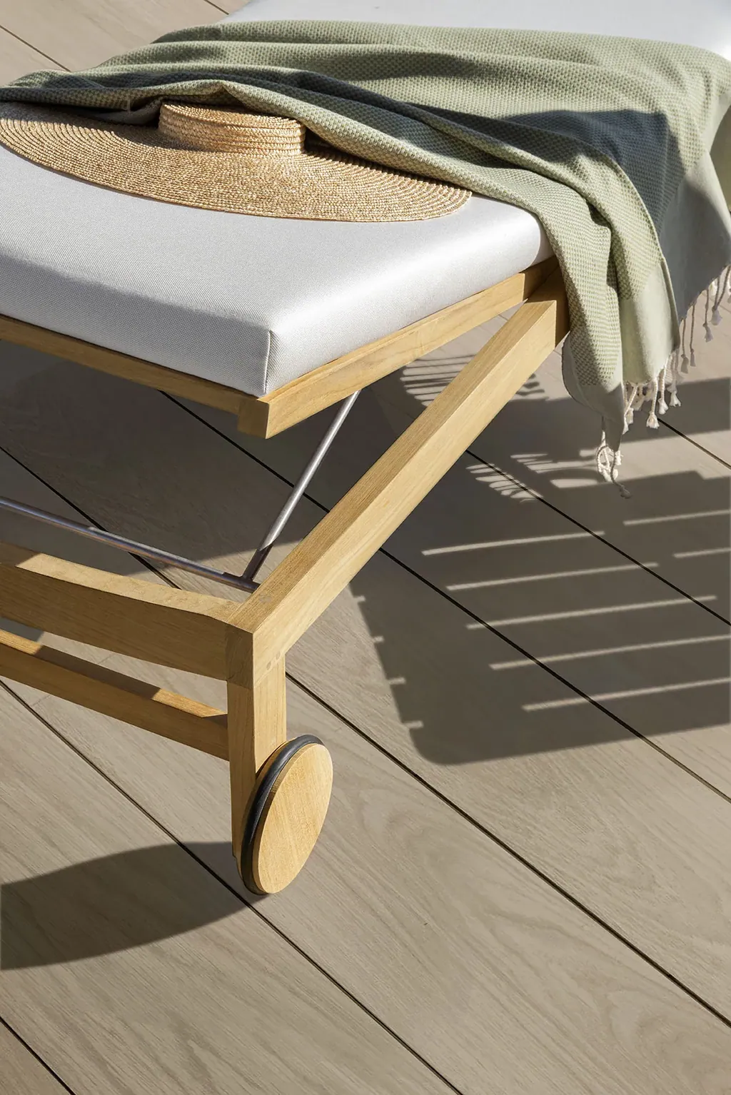 Das solide, zweckmäßige Holzgestell der Liege Sand, mit verstellbarer Rückenlehne, ist in der leichteren Version mit einem angenehmen, wasserdichten Stoff bespannt bzw. in der Ausführung ganz aus Teakholz mit einer weichen Matte bestückt. Die Sonnenliegen aus Teakholz und Synthetikgeflecht in zwei Ausführungen bilden einen attraktiven Gartenmöbel-Set. Das warme und dennoch einfache Design der Ethimo Produkte wird durch die Vereinigung des zeitgemäßen Styling mit der Neuinterpretation der klassischen Formen, so dass diese Möbel frisch und vertraut zugleich wirken, betont. Die Ethimo Farbpalette ist von italienischen Landschaften inspiriert. Sie verfügt über die verschiedenen Grüntöne der Toskana, sowie des intensiven Blau des Mittelmeeres und das Weiß der Strände im Süden...