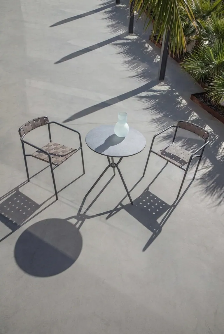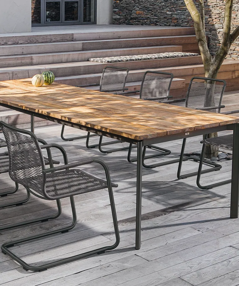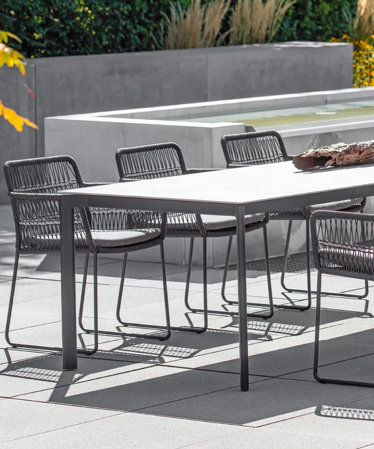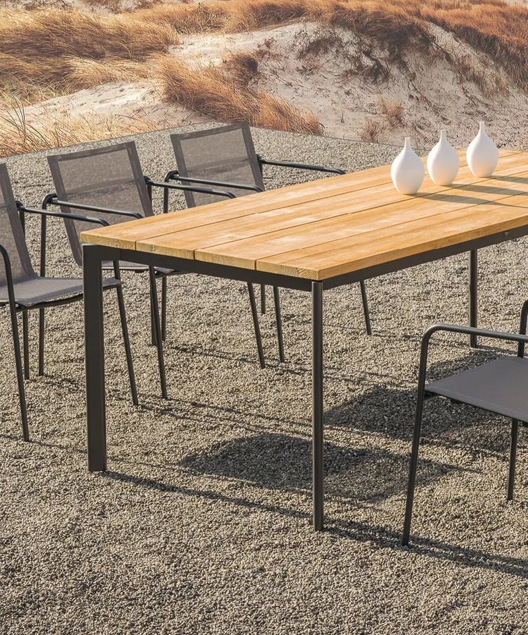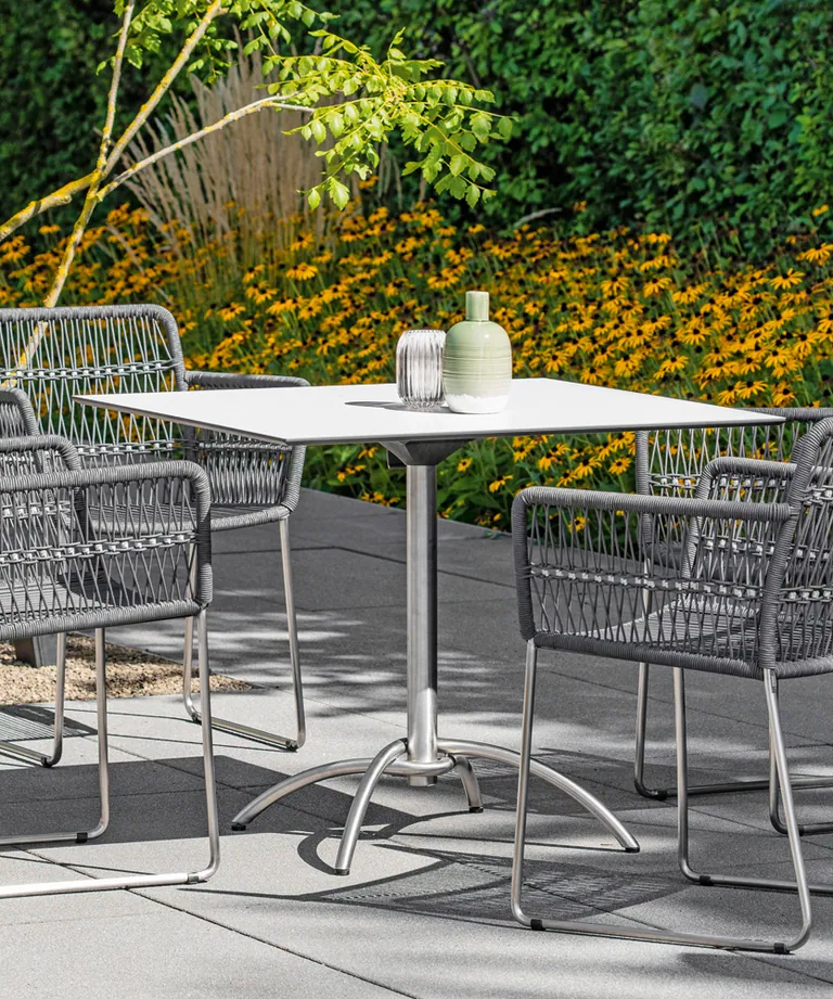 Das robuste Aluminiumgestell der Rio Tische in anthrazit oder metallic-silber ist eine perfekte Verbindung zu allen Stühlen aus dem gleichen Material. Die stabilen Tischbeine (50x50mm) in Verbindung mit dem solide verschweißten Rahmen tragen auf elegante Weise die unterschiedlichen Tischplatten. Oberflächen aus fm-laminat spezial, fm-ceramtop oder Teak ermöglichen eine perfekte Kombination zu den Rio Sesseln, aber auch zu vielen anderen Sesseln unseres Sortiments. Schraubgleiter ermöglichen einen Höhenausgleich bei Bodenunebenheiten.