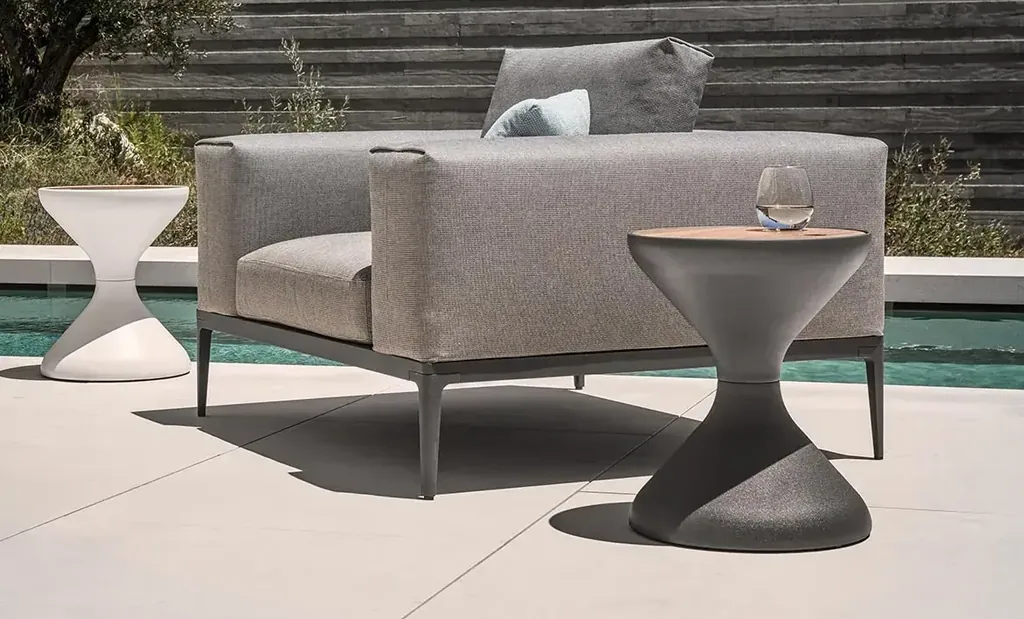 Die Inspiration ist fast zu offensichtlich – zwei glockenförmige Elemente zusammen ergeben die Form dieses kleinen Beistelltisches. Der organischen, fließenden Linien sind ein wunderbarer Hingucker für jeden Außenbereich The inspiration is almost too obvious - two bells joined together to make up the shape of this small side table. The organic and fluid lines will make an eye-catching addition to any outdoor area.