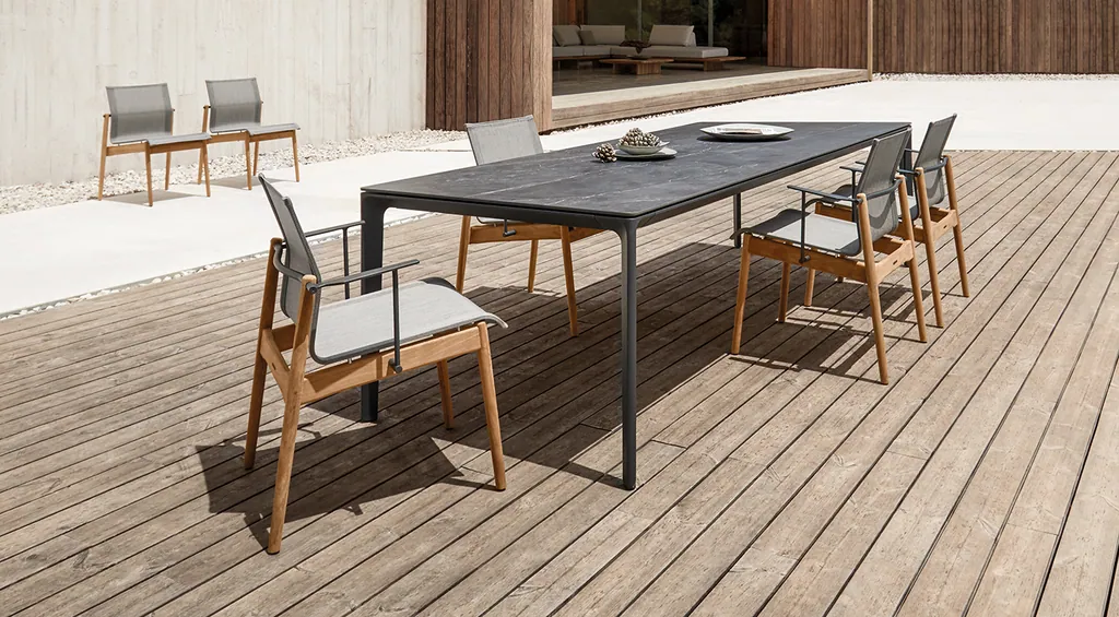 Gartenmöbel Im Außenbereich verbringen wir oft mehr Zeit mit Entspannung und Muße, und zum Essen lassen wir uns Zeit. Warum sollten wir es uns also nicht so angenehm machen wie möglich – mit einer Freischwinger-Konstruktion und flexibler Sling-Sitzfläche, die enormen Komfort bietet?